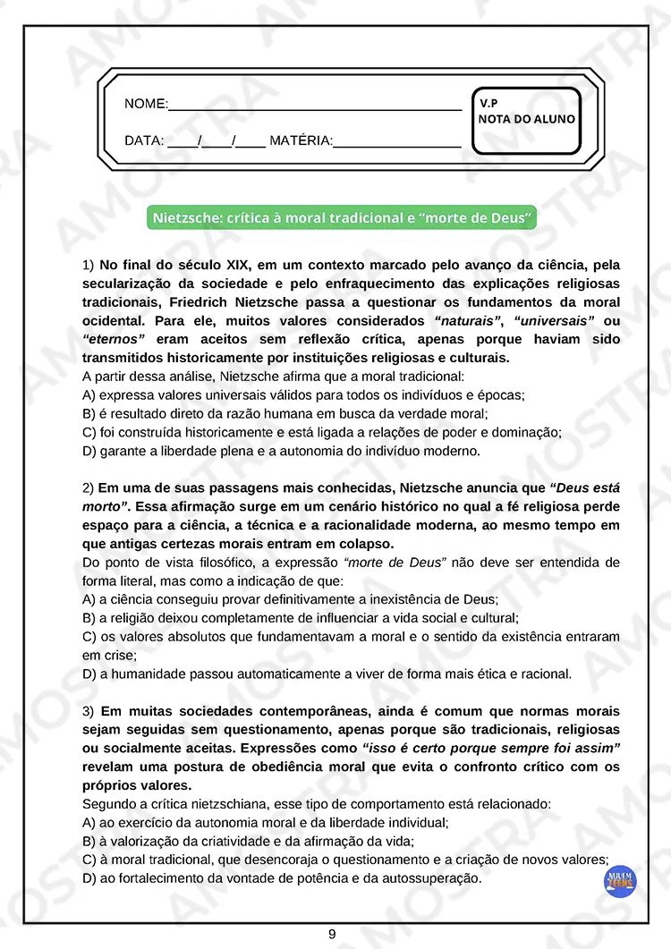 Você irá receber 90 páginas de Avaliações de Filosofia contendo gabaritos…